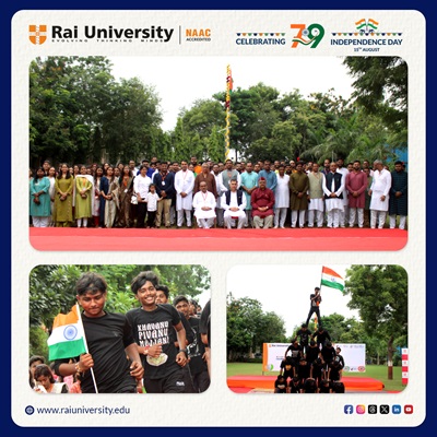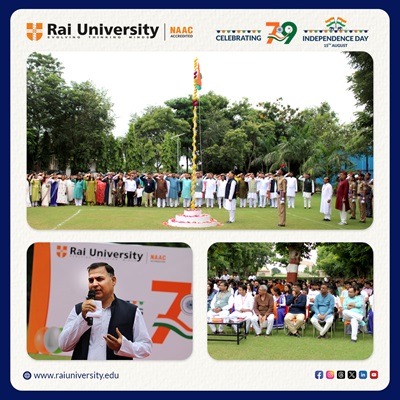 Rai University celebrated the 79th Independence Day with great enthusiasm and patriotic spirit. The event began with the flag hoisting ceremony, followed by inspiring words from Hon’ble Provost Prof. Dr. Anil Tomar. NCC cadets displayed discipline and dedication, reminding everyone of the values of courage and service.