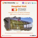 On 19th Aug 2025, a group of students and faculty members from the School of Pharmacy, Rai University, visited K.D. Hospital, Ahmedabad, Gujarat, as part of an academic initiative to provide practical exposure to hospital pharmacy operations. The visit, coordinated with Mr. Narsinh Gorkha, Manager of the hospital, commenced at 3:00 PM. Students explored different sections including the Entrance Area, Central Pharmacy, Inpatient Pharmacy, OT Pharmacy, and OPD Pharmacy. The purpose of this visit was to enhance their understanding of hospital pharmacy operations, documentation, and record-keeping. Through guided exposure, students gained valuable insights into various aspects such as medication management, dispensing, and compounding, along with patient care and counseling practices that emphasized the importance of adherence and therapy management. They were also introduced to drug information services, interdisciplinary collaboration within healthcare teams, and regulatory requirements ensuring quality assurance. Observing clinical rounds provided them an understanding of medication reconciliation, therapeutic monitoring, and the pharmacist’s role in patient care. Additionally, students learned about infection control practices, sterile compounding, and specialized services including chemotherapy and parenteral nutrition. Overall, the visit enriched students’ knowledge by bridging theoretical learning with practical hospital experience, equipping them for future pharmacy practice and professional competence.